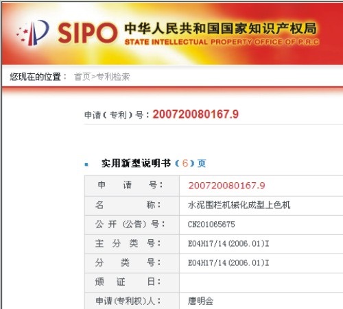 为了保护我司的创新成果,防止科研成果流失,同时也有利于科技进步和经济的发展。我公司于2007年3月特申请“水泥围栏机械化成型上色机”专利,于2008年5月获得中华人民共和国国家知识产权局审批并取得专利证书,欢迎广大投资者登陆www.sipo.gov.cn(中华人民共和国国家知识产权局主办网站)核查、监督。